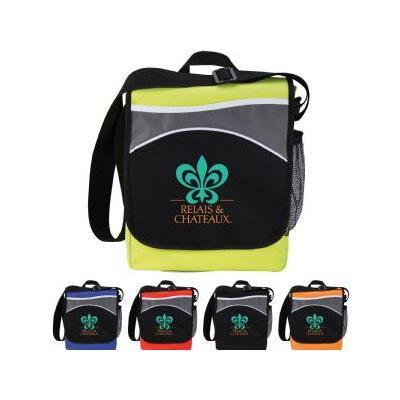 flap includes pen sleeves pocket and zippered mesh pocket. Side mesh pocket. Adjustable shoulder strap and top carry handle. Price includes 1 colour 1 position print.