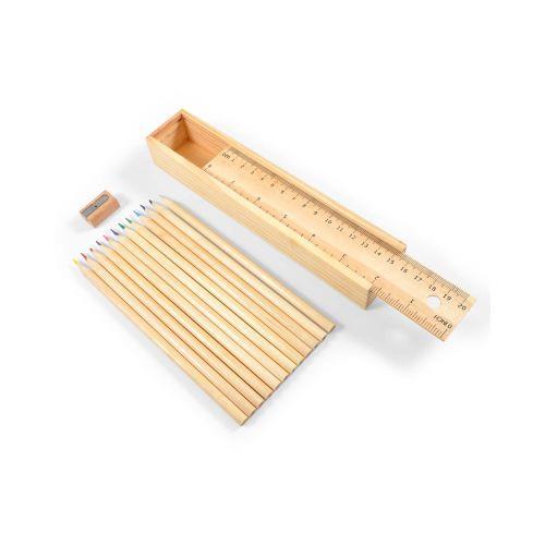 Set of 12 full sized sharpened natural coloured pencils in timber case with sliding lid. The lid has a 20cm metric/8" imperial ruler markings on 1 side. The other side is blank for logo decoration. Wooden pencil sharpener included.